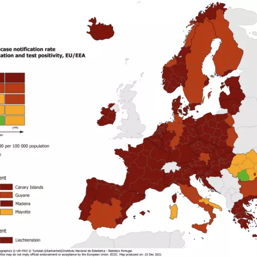 European Centre for Disease Prevention and Control (ECDC) heldur úti upplýsingavef um Covid-19 með gagnlegum upplýsingum fyrir fólk á faraldsfæti. Kortið var uppfært 23. desember 2021. Samkvæmt eftirfarandi töflu er nýgengi innanlandssmita á Íslandi 617 sem leiðir til þess að landið er dökkrautt. Ísland var sett inn í töfluna til samanburðar við sjálfstjórnarhéruð Spánar. Aðeins þrjú sjálfstjórnarhéruð á Spáni eru með lægri smittíðni en Ísland. Prósentuhlutfall jákvæðra sýna hefur alls staðar hækkað og er Omicron-afbrigðinu að þakka. Það er 70 sinnum meira smitandi en veikindin eru vægari verði á annað borð eftir þeim tekið. Gert er ráð fyrir að um helmingur fullorðinna fái engin einkenni og um 75% yngra fólks.