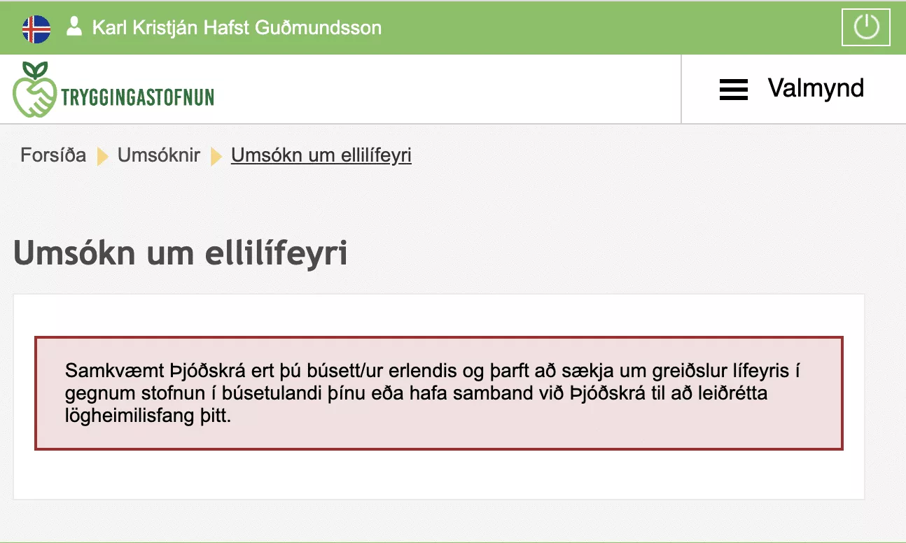 Enn og aftur, ég óska eftir því að fá eyðublað frá TR á íslensku sem ég get sent inn um hæl til að sækja um ellilífeyrinn eða þá að það sé opnað fyrir þá umsókn þannig að ég geti sótt um með rafrænum hætti þrátt fyrir að vera búsettur erlendis.