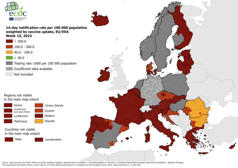 Smittíðni á Spáni og Íslandi 21. apríl 2022